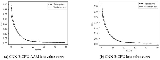 The validation set accounted for 10% of the training set and was employed to monitor the model’s performance during training, enabling the timely detection of overfitting and other issues in both the training and validation processes. The loss value curves of the CNN-BiGRU-AAM and CNN-BiGRU data are shown in Figure 8a and Figure 8b, respectively, from which it can be seen that the loss of the validation set of the training set is gradually decreasing, and regularization reduces the risk of overfitting.