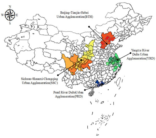 We selected four major urban agglomerations in China as samples to study the measurement of CCLE under carbon constraints, namely Beijing–Tianjin–Hebei (BTH), the Yangtze River Delta (YRD), Sichuan–Shaanxi–Chongqing (SSC), and the Pearl River Delta (PRD). Their scope and schematic location in China are shown in Figure 1.