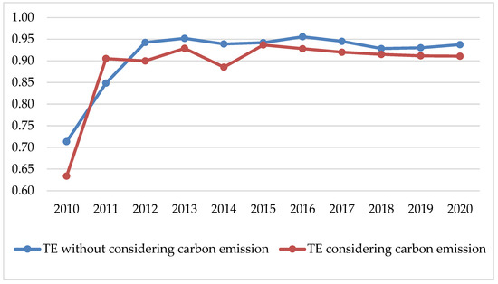 Whether carbon emission is included in the input variable or not, the TE of the study area exhibits a steady upward trend between 2012 and 2020, which shows that the CCLE has improved in recent years. As shown in Figure 2, when carbon emission is included in the input index, the TE of CCL decreases, and the efficiency, neglecting carbon emission, is overestimated. The figure shows that if investment factors, such as capital, labor, and technology, are exclusively considered, and energy and environmental constraints are ignored, the calculation results are not accurate. Therefore, when constructing the evaluation index system, considering carbon emission is more in line with the actual situation, which also verifies the rationality of the model constructed in this paper.