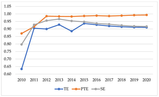 Although the CCLE considering carbon emission show continuous improvement from 2010 to 2020, there are variations in the trends of TE, PTE, and SE, as demonstrated in Figure 3. The PTE is the closest to the efficiency frontier, remaining at a high level and maintaining an upward trend, indicating a high level of technology and management in the study area as a whole. However, in contrast to the increasing trend in PTE, the trends for combined TE and SE are much closer, both showing an upward trend from 2010 to 2012 and a downward trend after 2013.