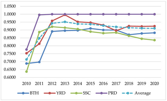 In terms of SE, the PRD remained at the frontier of efficiency, while the YRD was closer to the average. Taking 2012 as the time point, the SE of the BTH was the lowest in the first period, and the SE of the SSC was the lowest, demonstrating a downward trend. Therefore, for the SSC, in the future, efforts should be made to promote factor agglomeration and industrial synergy development to improve SE.
