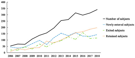 We adopted the method used by Balland et al. (2013) [28] to build the cooperative network for each phase (2006–2010, 2011–2015, 2016–2018). The subjects of analysis are those who have appeared for at least two years and formed collaborative relationships at least twice within this phase. Consequently, 26,516 items of joint applications for patents were screened, with 758 participating behavioral subjects in all the three stages. The cooperative innovation networks were constructed separately for the three phases of 2006–2010 (five binary matrices of 176 × 176), 2011–2015 (five binary matrices of 402 × 402), and 2016–2018 (three binary matrices of 419 × 419).