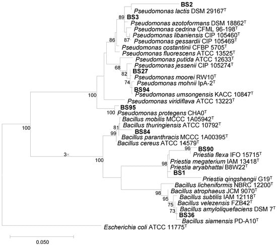 A phylogenetic analysis of 16S rRNA showed the cluster of the PGPR strains under study with three different genera, namely Bacillus, Priestia, and Pseudomonas. The identification of the strains at the species level was not possible and would only be accomplished with additional analyses using other suitable DNA barcodes [48,49,50].