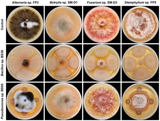 Antifungal activity of Bacillus sp. BS36 and Pseudomonas sp. BS95 against Alternaria sp. FP3, Botrytis sp. SM-D1, Fusarium sp. SM-D3, and Stemphylium sp. FP5, in dual culture assay. Bacillus sp. BS36 and Pseudomonas sp. BS95, respectively: MGI = 82.7 ± 4.3 and 38.5 ± 4.7% for Alternaria sp. FP3, MGI = 60.6 ± 1.7 and 0.0 ± 0.0% for Botrytis sp. SM-D1, MGI = 69.2 ± 0.0 and 0.0 ± 0.0% for Fusarium sp. SM-D3, MGI = 79.6 ± 0.0 and 29.8 ± 1.7% for Stemphylium sp. FP5.