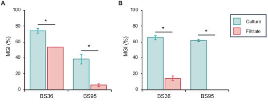 Antifungal activity of cultures and cell-free filtrates of Bacillus sp. BS36 and Pseudomonas sp. BS95 against Alternaria sp. AF12 (A) and Fusarium sp. AF68 (B), expressed by MGI. Values represent the mean ± SD (n = 4). Asterisks (*) indicate mean values significantly different (p ≤ 0.05) according to independent samples t-test ((A): t (3) = 10.99 and p < 0.001 for Bacillus sp. BS36, and t (3.6) = 8.87 and p < 0.001 for Pseudomonas sp. BS95; (B): t (6) = 21.03 and p < 0.001 for Bacillus sp. BS36, and t (3) = 63.36 and p < 0.001 for Pseudomonas sp. BS95).