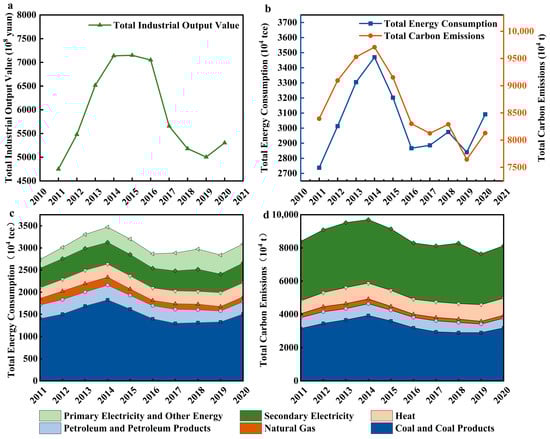 Total industrial output value, energy consumption, and carbon emissions of the manufacturing industry in Gansu Province during 2011–2020: (a) total industrial output value, (b) energy consumption and carbon emissions, (c) energy consumption structure, and (d) total carbon emissions structure.