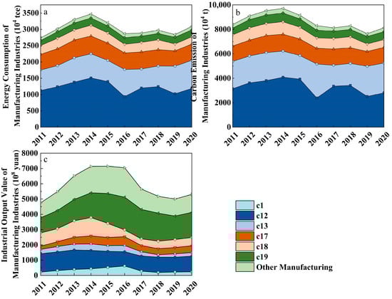 Figure 2 shows the changes in energy consumption, carbon emissions, and economic efficiency for 28 manufacturing industries in Gansu Province from 2011 to 2020. The figures emphasize the structural changes within these industries. Significant disparities exist in energy consumption, carbon emissions, and economic efficiency among Gansu’s manufacturing industries. The Smelting and Pressing of Ferrous Metals (c18) industry, a specialist in ferrous metal processing, is the primary energy consumer and carbon-emission sector in Figure 2a,b, accounting for approximately 40% of the total energy consumption in the sector. Besides c18, the top energy-consuming industries are c19, c12, the Manufacture of Raw Chemical Materials and Chemical Products (c13), and the Manufacture of Non-Metallic Mineral Products (c17), with their 10-year energy consumption proportions being 20–30%, 16–18%, 7–11%, and 6–7%, respectively. These five industries are capital and resource-intensive. Additionally, the total energy consumption of other manufacturing industries accounts for only about 3% of the sector’s total energy consumption. Over the past decade, the industries of Smelting and Pressing of Non-Ferrous Metals (c19) and Processing of Oil, Coal, and Other Fuels (c12) have shown significant growth, collectively contributing to about 46% of the total industrial output in the manufacturing sector in Figure 2c.