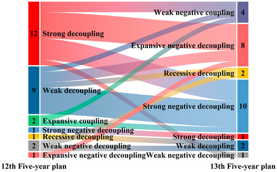 This study evaluates the decoupling relationships between carbon emissions and total industrial output in Gansu Province’s manufacturing industries, focusing on the periods of the 12th (2011–2015) and 13th (2016–2020) Five-Year Plans, as depicted in Figure 3. Following the 12th Five-Year Plan, industries c12, c18, c24 (Manufacture of Electrical Machinery and Equipment), and c28 (Comprehensive Utilization of Resource Waste and Metal Products, Machinery, and Equipment Repair) experienced poor negative decoupling between carbon emissions and industrial output, in contrast to other manufacturing industries, which exhibited either decoupling or linkage. The carbon emission-to-industrial output ratio in Gansu’s manufacturing industries during the 12th Five-Year Plan was favorable. Following the 13th Five-Year Plan, industries c4, c12, c15 (Manufacture of Chemical Fibers), c18, and c28 showed improved decoupling between carbon emissions and industrial output, while other manufacturing industries experienced negative decoupling or linkage. The carbon emission-to-industrial output ratio in Gansu’s manufacturing industries during the 13th Five-Year Plan period was less favorable than the 12th Five-Year Plan period.