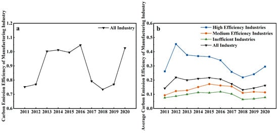 Carbon emission efficiency of manufacturing industry in Gansu Province during 2011–2020: (a) overall industry and (b) average value by industry.