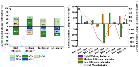 Carbon emissions: (a) cumulative effect contribution rates and (b) year-by-year industry effects of Gansu Province’s manufacturing industry during 2011–2020.