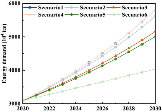 By 2030, under Scenarios 1 through 6, the projected primary energy demand in China is expected to be 5803 × 104 tons, 5616 × 104 tons, 5157 × 104 tons, 5803 × 104 tons, 5009 × 104 tons, and 4032 × 104 tons, respectively. These amounts represent 1.88, 1.82, 1.67, 1.88, 1.62, and 1.30 times the level of 2020, respectively.