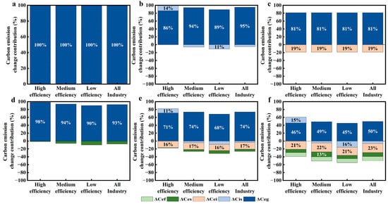 Cumulative effect contribution of future carbon emissions from the manufacturing sector in Gansu Province: (a) Scenario 1: economic growth; (b) Scenario 2: high-efficiency sector prioritization; (c) Scenario 3: energy intensity reduction; (d) Scenario 4: energy structure optimization; (e) Scenario 5: comprehensive measures scenario; and (f) Scenario 6: optimized scenario.