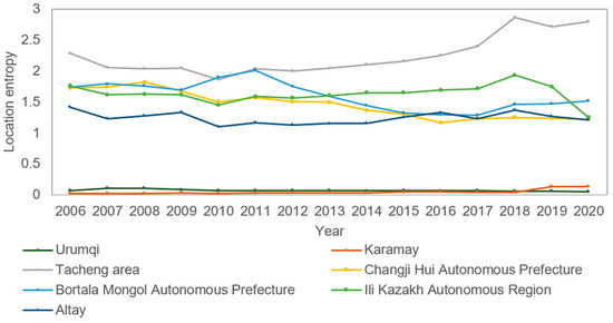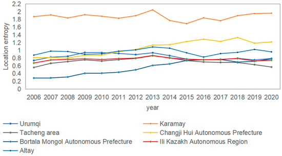 where Ct is the total carbon emissions of a city in Xinjiang in year t; ADi is the volume of activity that led to the emissions, such as consumption of oil and gas, net purchases of electricity and steam, etc.; and EF is the coefficient corresponding to the activity data. There are many methods to measure industrial clustering, such as location entropy, location Gini coefficient, Herfindahl index, industry cluster index, etc. Compared with other methods, location entropy is more reliable and accurate in reflecting the overall level of relevant industries in the region, and it can better reflect the level of regional clustering, so many scholars use this method to evaluate the degree of industrial clustering. For example, Qiu et al. used location entropy to measure the clustering effect of the new energy industry and evaluated and compared the clustering effect and development status of new energy industries in the EU through calculation and analysis [31]. Xinjiang is dominated by primary and secondary industries, so in this paper, we need to calculate the degree of primary and secondary industry clustering.