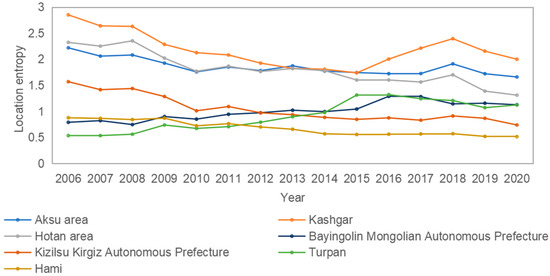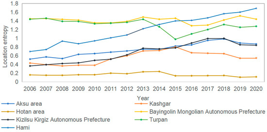 As shown in Figure 5, among the five regions and cities in southern Xinjiang, the level of secondary industry clustering in Bayingolin Mongolian Autonomous Prefecture is always greater than 1, which is higher than the average in Xinjiang as a whole, and the clustering effect is obvious. During 2006 to 2020, the level of secondary industry clustering in Aksu, Kashgar, and Kizilsu was less than 1, but on the whole, they all show an upward trend, and the level increased. The level of secondary industry clustering in the Hotan region obviously lagged behind that of other regions and cities. In eastern Xinjiang, the level of secondary industry clustering in Turpan has always been greater than 1, with an obvious clustering effect, while the level in Hami shows an upward trend, with the level of secondary industry clustering exceeding 1 in 2011, and since then it has been on an upward trend.