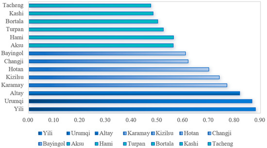 As can be seen from Table 4 and Table 5, some of the regions and cities in Xinjiang achieved a better state of efficiency over the past 15 years, but this state is unstable, which may be related to the local geographic environment and government policies, and more efforts are needed to maintain and improve the efficiency. Sorting the mean values of low-carbon economic efficiency of the 14 regions and cities (see Figure 6), we find that during the study period, there were obvious differences in low-carbon economic efficiency. According to the mean values, the 14 regions and cities are roughly divided into three categories: The first category is inefficient regions and cities. As can be seen in the figure, of the six regions and cities with an average low-carbon economic efficiency of 0.4–0.6 during 2006–2020, only Tacheng and Bortala Mongol Autonomous Prefecture are located in northern Xinjiang. Combined with Table 4, we find that the low-carbon economic efficiency of these regions and cities did not reach 1 in the 15-year period, and their carbon emission problems were relatively serious. The second category is regions and cities with medium low-carbon economic efficiency, with average values ranging from 0.6 to 0.8, including Bayingolin Mongolian Autonomous Prefecture, Changji, Karamay, Kizilsu, and Hotan, of which Changji and Karamay are located in northern Xinjiang. Combined with Table 5, we find that the low-carbon economic efficiency of Hotan and Kizilsu sometimes exceeded 1 over the 15 years, with large fluctuations. In general, these four regions and cities are bottlenecks for carbon emission reduction and economic development in Xinjiang. The third category is regions and cities with medium-high efficiency, with a mean value greater than 0.8, including Altay, Urumqi, and Ili. These are all located in northern Xinjiang, and all of them had years with efficiency greater than 1, which means they have great potential for carbon emission reduction, and it will be easy to achieve results.