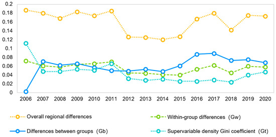 In order to further measure regional differences in the efficiency of a low-carbon economy under the influence of industrial clustering in Xinjiang and its law, the Dagum’s Gini coefficient is used to decompose the efficiency of SE-SBM, and the results of the measurements are visualized in Figure 7.