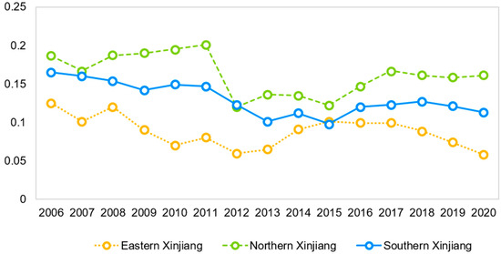 The following can be seen in Figure 8: (1) Overall, although the intra-regional differences fluctuate considerably, the intra-regional differences show a decreasing trend compared to the previous years, with the largest intra-regional differences in northern Xinjiang and the smallest in eastern Xinjiang, and the decreasing trend is more obvious. (2) The intra-regional differences in Xinjiang’s low-carbon economic efficiency show that it is higher in northern Xinjiang than southern Xinjiang and higher in southern Xinjiang than eastern Xinjiang. The climate conditions and industries in eastern Xinjiang have great commonality and correlation, and, to a large extent, clustering of industries such as wind energy and agriculture has been achieved, but the primary industry clustering of the two regions is average. Northern Xinjiang is dominated by the primary and secondary industries, and although the overall development is better than that of southern Xinjiang, the development of the region is mainly based on the core of Urumqi and radiates to the surrounding areas. Technology, location, and other factors have a great impact on industrial clustering and local development, with obvious differences between regions. Southern Xinjiang is vast and sparsely populated, the links between regions are not strong, and due to the location, technology and other aspects are impacted by the large differences, so although the primary industry is the main industry, the differences between regions are also large. Combined with the relevant policies, it can be seen that Xinjiang has been optimizing and reasonably clustering industries in recent years under the support of policies, and the local government has paid more attention to the coordinated and synchronous development of a low-carbon economy in each region.