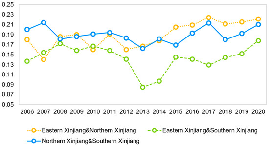 As can be seen from Figure 9, the inter-regional differences in low-carbon economic efficiency under the influence of industrial clustering in Xinjiang during the sample period show a fluctuating upward trend, in which the inter-regional differences between eastern and southern Xinjiang have basically been at the lowest level, indicating that the gap between these two areas is the smallest and that overall, the inter-regional differences between eastern and northern Xinjiang and between northern and southern Xinjiang are larger. It is possible that development in terms of infrastructure, technology, etc., is better in northern Xinjiang than in southern and eastern Xinjiang, and the radiation effect of the provincial capital of Urumqi is obvious, which prompts the neighboring cities to respond and implement the relevant policies issued by the government in a timely and rapid manner, and there is a good foundation for industrial clustering. In addition, the high-tech industry in northern Xinjiang has formed a certain scale of clustering and has certain geographical advantages. Eastern Xinjiang is greatly affected by the environmental factors of its location, and the efficiency of resource utilization is not as good as that in northern Xinjiang.