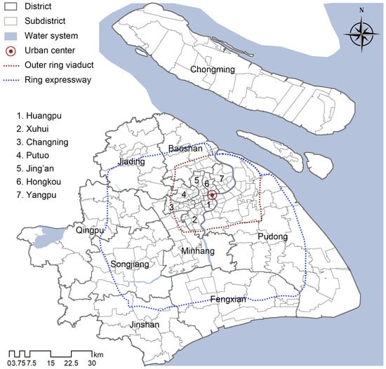 The spatial units in this study are Shanghai’s 225 subdistricts, which belong to 16 districts. Compared with uniform grids, the subdistricts are basic administrative units in Shanghai, fit into boundaries of urban management, land use, economic, and social properties, and therefore more suitable as the study units. In the study area, the urban center is the Lujiazui CBD, the central city is the area inside the outer ring viaduct, which is approximately 15 km around the urban center, and the suburban zone is the area between the outer ring viaduct and the ring expressway, which is approximately 15–40 km away from the urban center. Additionally, the area outside the ring expressway is the outskirt zone (Figure 1).