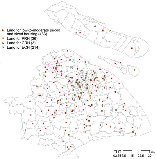 Shanghai is chosen as a case study, since it is a representative Chinese metropolis that is experiencing serious social segregation problems [25,26,27]. Compared with most existing urban China studies [18,19,23,24], which analyzed the demographical characteristics of poor urban populations, our study made use of the spatial distribution and concentration patterns in social housing to reveal the situation of low-to-moderate-income populations whose living demands are guaranteed by the housing security system in China. According to the terms in ‘Guidelines for construction of social housing in Shanghai’ (2010) and ‘Shanghai Housing Development 12th Five Year Plan’ (2012), the housing security system in Shanghai includes four types of housing. These are cheap rental housing (CRH, Lianzu Fang) for the lowest-income households, economical and comfortable housing (ECH, Jingji Shiyong Fang)/shared-ownership housing (SOH, Gongyou Chanquan Fang) for low-to-moderate-income households, public rental housing (PRH, Gongzu Fang) for certain groups such as new graduates at slightly lower rental price than the market level, and resettlement housing (RH, Dongqian Anzhi Fang)/capped-price housing (CPH, Xianjia Shangpin Fang) for relocated residents or farmers from urban renovation projects. In this article, we use the term ‘social housing’ to refer to the four types of housing. The regulation stage for the housing market, emphasizing the housing security system, was chosen as the study period; it began in 2008, signified by the Shanghai Municipal Government issuing ‘Implementation Opinions on Implementing the Spirit of the Documents from Office of the State Council and Promoting the Healthy Development of this Municipality’s Real Estate Market’, and ended in 2020, when COVID-19 substantially changed China’s urban life.