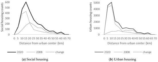 In comparison, Figure 3b shows the geographical profiles of urban housing in 2008 and 2020. The general patterns in urban housing remained almost the same over these years: more concentrated in the central city, within 10 km of the urban center. The number of residential compounds drops dramatically at the 10–15 km mark and shows a decreasing pattern further away from the center, only increasing a little at the 25–30 km mark, close to the boundary of the suburban zone. The change in urban housing is smooth over different distances, compared with that in social housing.