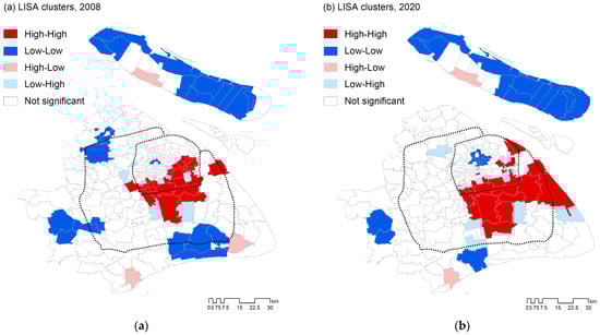 LISA clusters of social housing counts at the subdistrict level: (a) 2008, (b) 2020.