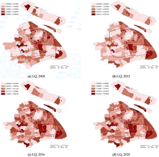 Following the spatial autocorrelation analysis, another issue to be examined is the extent to which social housing is concentrated in different urban zones. The LQ outputs were classified into five grades using the Jenks natural breaks classification method, illustrating the spatial concentration of social housing in different subdistricts (Figure 5). The patterns in 2008, 2012, 2016, and 2020 are presented to explain the changing process.