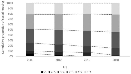 Percentages of social housing found in subdistrict units with a different LQ from 2008 to 2020, Shanghai.