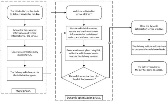 A two-stage mathematical model is established in this research for the purpose of addressing the problem, consisting of a static stage and a dynamic optimization stage. In the static stage, the distribution center generates a static delivery route plan using an improved genetic algorithm based on known customer information. During the static delivery plan execution, on the condition that dynamic events occur, the dynamic optimization stage begins. In this stage, a route updating strategy is introduced to regulate the routes in real time for the purpose of accommodating the continuously generated dynamic demands. Currently, there are several existing one-time strategies, such as the first-come-first-serve strategy, random queue center location strategy, and nearest-neighbor priority strategy. Additionally, two main mechanisms are employed to initiate the route updates as follows: customer-based and time-based. When two customers are far apart and the travel time is longer, the customer-based mechanism requires more responses to the dynamic demands, resulting in poor service efficiency. On the other hand, time-based route updates occur at regular intervals. By setting different update times, this mechanism can avoid an excessive response to dynamic demands and has relatively practical utility. Therefore, this study selects time-based updates as the initiation mechanism for route updating. The specific steps and solution process are illustrated in Figure 1 below.
