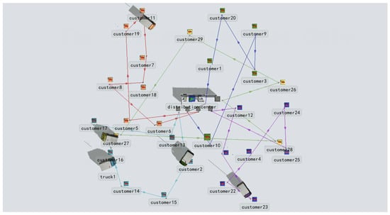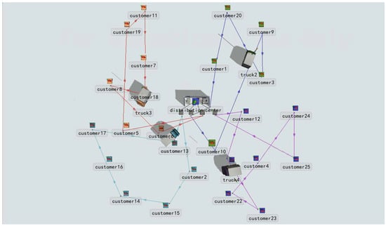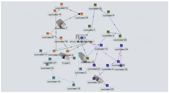 Based on the constructed model, we developed a genetic algorithm code in MATLAB and set the relevant parameters. The parameters for the genetic algorithm were configured as below: a population size of 100, a maximal iteration count of 200, a crossover ratio of 0.9, and a mutation ratio of 0.2. After 200 iterations, the total delivery cost obtained was 1207.01, with four vehicles used for delivery. The delivery routes are presented in Table 5. To visually observe the entire delivery scenario, we used the FlexSim software 2023 simulation model to verify the feasibility of the delivery solution. The simulated delivery routes are illustrated in Figure 2.