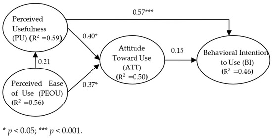 The indirect effect of PEOU on BI was estimated at 0.12 (0.21 × 0.57), mediated by PU. Additionally, the indirect effect of PEOU on BI was estimated at 0.06 (0.37 × 0.15), mediated by ATT. Furthermore, the indirect effect of PEOU on BI was estimated at 0.01 (0.21 × 0.40 × 0.15), mediated by PU and ATT. Therefore, the total indirect effect of PEOU on BI was estimated at 0.19 (0.12 + 0.06 + 0.01).