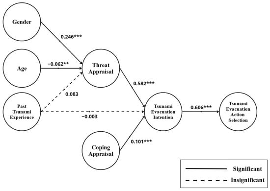 Figure 2 illustrates the model developed in this study, which integrates the constructs of threat appraisal, coping appraisal, and tsunami evacuation intention and behavior. It aims to provide a comprehensive understanding of the factors related to individuals’ tsunami evacuation. Specifically, this study examines the influence of age and gender on threat appraisal and past tsunami experience on threat appraisal and evacuation intention, as well as the relationship between evacuation intention and action selection. Additionally, the model adds a control variable for different respondent types. Separating data into three groups—residents, non-local workers, and travelers—might be beneficial for analyzing and understanding their behavior in the case of a disaster. In this research, we categorize our respondents into three distinct groups: