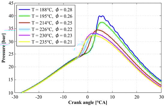 The engine operation was restricted to a few points due to the difficulty of controlling the fuel flow and the limitation of the intake temperature control system to respond quickly to variations in the desired temperature. Figure 2 shows the average in-cylinder pressure for all IVC temperatures and equivalence ratios in which the HCCI combustion could be obtained. Maximum pressures between 32 bar and 40 bar were achieved.