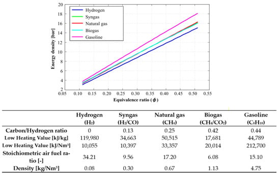 In HCCI combustion, the ED of hydrogen is lower when compared with gasoline and other fuels for all equivalence ratios (). As the equivalence ratio decreases, the difference in ED between hydrogen and gasoline becomes smaller. At an equivalence ratio of 0.50, hydrogen has a 17% lower ED than gasoline, while the difference between hydrogen and syngas is only 7%. Meanwhile, the ED of natural gas (CH4), biogas (60% CH4–40% CO2), and syngas (80% H2–20% CO) is similar, so the engine performance can be expected to be quite similar using any of these fuels. Despite having the highest heating value, the higher air requirements (higher AFRs) and lower density of hydrogen offset its advantage. In stoichiometric conditions, hydrogen’s low density generates a displacement of up to 29.6% of the intake air, while NG and gasoline only displace 9.5% and 1.7% of air, respectively. Therefore, the loss in volumetric performance of the engine is the main factor contributing to the power loss, as Boehman et al. [19] and Hagos et al. [36] reported.