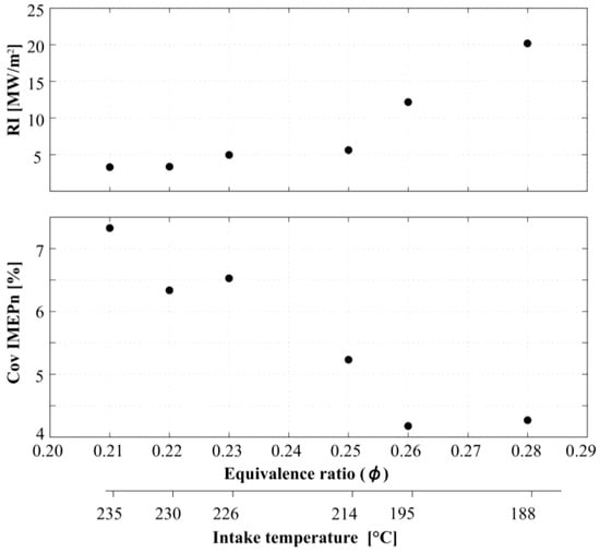 The engine stability at each experimental point was related to the Cov-IMEP and the RI values. Figure 4 shows an opposite trend between the engine operating limits concerning the equivalence ratio and the intake temperature. The Cov-IMEP grows with lower equivalence ratios and higher intake temperatures (lower energy density), while the RI becomes lower under these conditions. All experimental points generally have a Cov-IMEP of less than 10%, which is within the allowable range for stationary engines [26]. In Figure 5, the dispersion map for the IMEP of 100 engines’ cycles is shown. Some points were obtained with RI values higher than 5 MW/m2, values outside the limit recommended in the literature [11].