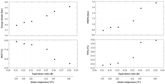 IMEPn and the ITEn are related to other engine operation parameters, such as energy density and recirculated gas fraction (RGF). As can be seen in Figure 6, at a lower intake temperature and a higher equivalence ratio, the energy density was increased while the amount of recirculated gases decreased; this generated a greater availability of energy inside the combustion chamber that, added to the start of combustion in the first moments of the expansion stroke, caused a higher rate of transformation of the energy entered into useful work. The maximum IMEPn achieved was 1.75 bar, which, compared to those values reported in previous research [24,26,27,28], is between 20% and 40% lower. On the other hand, the maximum ITEn reached was 34.5%, higher than those values reported in previous research [26,27] but lower for those reported by other studies [24,25]. The IMEPn and ITEn losses with low equivalence ratios and high intake temperatures are related to decreased energy density and increased recirculated gases.