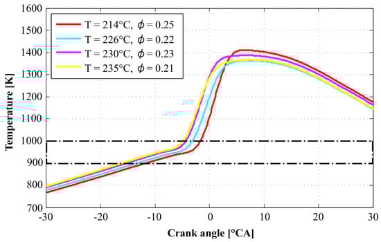 One characteristic of HCCI combustion is the low temperatures in the combustion chamber. These temperatures ensure low production of nitrogen oxides (NOx) but are responsible for most unburned fuel emissions. Figure 7 shows the in-cylinder temperature for the four experimental points in which it was possible to carry out a heat release analysis (it is impossible to analyze experimental points with high ringing intensity through a heat release analysis). As can be seen, the maximum temperature values reached are around 1400 K, the maximum value (1411 K) was obtained for an intake temperature of 214 °C and an equivalence ratio of 0.25, and the minimum value (1363 K) was for an intake temperature of 230 °C and an equivalence ratio of 0.22. The maximum temperature depends on the energy density. This figure also shows that the temperature interval in which the ignition occurred (900 °C to 1000 °C) coincides with those reported in previous research [24,27]. The NOx emissions were very low (in a range of 1 to 18 ppm) because of the low-temperature combustion, and the Bacharach analyzer used in this research was not able to capture the trends for different experimental points because of its measuring range.