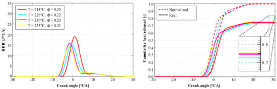 Figure 8 shows the heat release rate (HRR) and cumulative heat released (CHR) profiles. The HRR reached maximum values of 18 J/CA, which were lower than those reported in [27]. At higher energy density values, the maximum HRR increases and undergoes a displacement to the left of the TDC, influenced by the increase in the intake temperature. Without a measure of the amount of hydrogen in the exhaust gases, direct estimation of the combustion efficiency was not possible; however, combustion efficiency was indirectly estimated from the actual cumulative heat released (CHR) curve. Figure 8 (right) shows the real and normalized CHR. The maximum cumulative heat released fraction was around 75%, which indicates an energy loss due to incomplete combustion, crevices, and leaks to the crankcase close to 25%. The presence of fuel in the coldest areas of the combustion chamber, the high levels of recirculated gases, the high thermal conductivity of hydrogen, and the early opening of the exhaust valve in the expansion stroke contributed to this loss of efficiency.