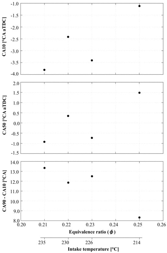 Figure 9 complements the analysis presented so far by presenting the values of CA10, CA50, and CA90-CA10. For the four operating points, the ignition was located before TDC, which may explain the loss of efficiency of these points with the two that cannot be analyzed but have a delayed CA10; see Figure 3. The increase in intake temperature tends to bring forward the start of combustion, as well as CA50, except for the operating point with an equivalence ratio of 0.23 and an intake temperature of 226 °C. These trends coincide with those reported in [24,27]. The CA10-CA90 becomes shorter as the equivalence ratios increase. The maximum CA10-CA90 is 13.3 °C, which is lower than reported for other combustion regimens in ICEs and coincides with what has been reported by [24,27].