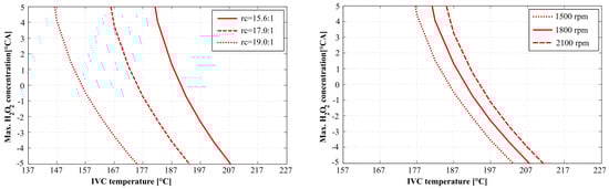 Figure 10 shows one-zone simulations of the effect of compression ratio and engine speed on the angle for the peak in molar concentration of H2O2, which is related to ignition (The next was made using CHEMKIN for HCCI combustion. A full description of the process can be found in a previous paper written by these same authors [37]), at different intake temperatures using detailed chemical kinetics. As can be seen in Figure 10, on the left, at a lower compression ratio, there is an increase in the intake temperature requirements that guarantee the ignition; an increase in the intake temperature translates into a decrease in the energy density, the volumetric efficiency of the cycle, and the thermal efficiency of the cycle. On the other hand, in Figure 10, on the right, as the engine speed increases, the intake temperature requirements also increase to guarantee ignition. This can be evidenced by comparing the intake temperature levels used in this work with those used in the works with which it is compared. On average, there were intake temperature values 100 °C higher than those reported in other works.