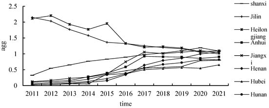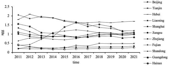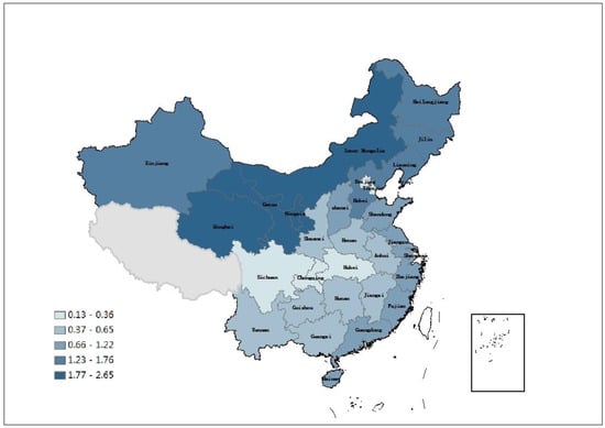 Based on the calculation formula for location entropy, this paper computes the location entropy coefficients of the new energy sector according to provincial installed capacity from 2011 to 2021. Figure 1, Figure 2 and Figure 3, respectively, illustrate the trends in location entropy coefficients in the provinces of China’s eastern, central, and western regions throughout the specified period, and Figure 4 shows the spatial distribution of the average value of new energy industries in 30 provinces and cities. It is evident that from 2011 to 2021, regions with location entropy coefficients greater than 1 persist nationwide, indicating the continuous presence of agglomeration in China’s new energy industry. During this period, the enhancement and decline in new energy industry agglomeration occur simultaneously on a national scale. The regions where the location entropy of the new energy industry has consistently exceeded 1 include Hebei, Liaoning, Inner Mongolia, Gansu, Qinghai, Ningxia, Xinjiang, Jilin, and Heilongjiang. Provinces with an increase in new energy industry location entropy surpassing 1 include Jiangsu, Shandong, Jiangxi, and Henan. Regions with a high level of agglomeration in China’s new energy industry can be broadly categorized into two types: those with a well-developed economic foundation and industrial level, such as Hebei, Jiangsu, and the Northeast Industrial Base, and those endowed with abundant natural resources, including Inner Mongolia, Gansu, and Xinjiang. From a regional perspective, although some western provinces show a descending trend, the agglomeration level of the new energy industry in the western region surpasses that in the central and eastern regions. The central region is experiencing an overall upward trend with significant potential for improvement, while the eastern region is generally on a declining trajectory, indicating insufficient momentum in the evolution of the new energy industry.