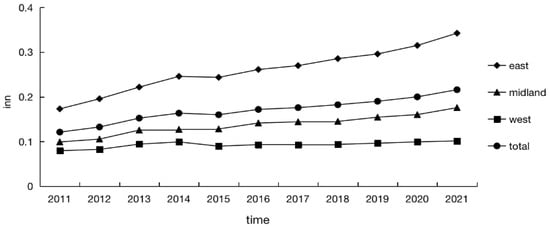 Figure 5 illustrates the nationwide, eastern, central, and western mean values and trends in green innovation performance from 2011 to 2021. From Figure 5, It is evident that a noticeable disparity in green innovation performance exists among the regions. The eastern region demonstrates markedly elevated green innovation performance, surpassing the national average, with a pronounced trend. This indicates that the innovation mechanisms within the confines of the eastern locality operate effectively, supported by a robust economic foundation, enabling the maintenance of consistently high levels of innovation. Green innovation performance in the central and western regions falls below the national average. The western region demonstrates inferior trends in both green innovation performance and growth compared to the central region. This suggests that, in the realm of innovation development, the industrial structures in the central and western regions are comparatively trailing the eastern region. There is evidence of technological and resource disconnection, yet there exists substantial potential for improvement. Overall, in advocating the advancement of green innovation, both at regional and national levels, there has been a consistent upward trend in green innovation performance. The level of green innovation performance follows a stepwise distribution pattern with the sequence of “East–Central–West”, where the eastern region consistently maintains a leading position, playing a pioneering role.