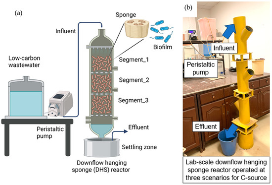 Downflow hanging sponge (DHS) reactor (a) schematic diagram; (b) real lab-scale image. The drawing was created with BioRender.com (Agreement number: VX26H709TR).