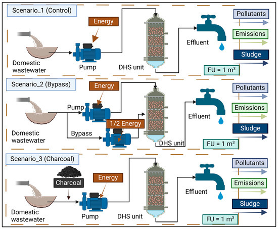 The objective of the LCA was to compare the three scenarios regarding the minimum environmental impacts and the maximum resource efficiency. This assessment focused on the operation of the DHS system, excluding materials for constructing the reactor, sponge media, and tank vessels that are common in the three scenarios. Figure 2 shows the system boundaries of the three scenarios under investigation, following the conceptual framework of ISO14040–14044 [35]. The system boundary included pump operation, DHS pollutant removal efficiencies, sludge generation, charcoal supplementation, and energy consumption. LCA calculations were performed over a functional unit (FU) of 1 m3 of treated domestic wastewater by the DHS, and all data were normalized to this unit.