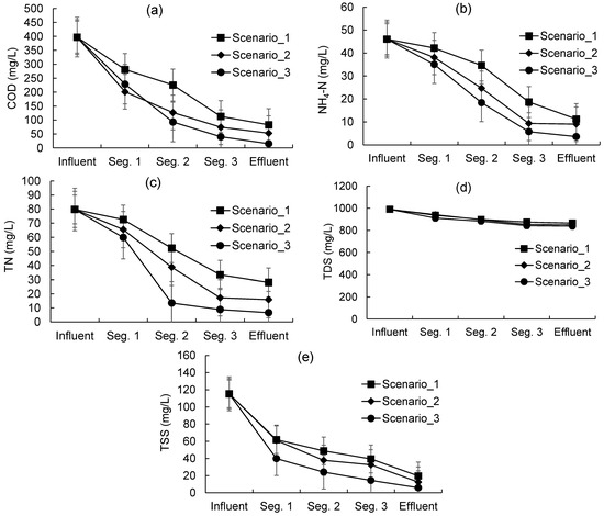 The COD concentrations decreased from 397 mg/L (influent) to 40–113 mg/L (effluent of three scenarios) along the reactor height (Figure 3a). This finding shows a statistical significance variation (p-value < 0.05) across the three segments. This occurrence could be attributed to the abundance of organic matter and oxygen at the top segment, promoting a higher aerobic microbial growth for COD removal [15]. However, this organic matter degradation pathway reduced the amount of available carbonaceous substrates (as COD concentrations) in the subsequent segments [21]. As such, heterotrophic bacteria in the first segment’s packing materials utilized the accessible substrate as an electron donor and natural oxygen as an electron acceptor for aerobic growth [10]. Some microbial species responsible for COD elimination, such as Selenomonas, Clostridiales, and Xanthomonas axonopodis, could be dominant at the top segment during sewage wastewater treatment [31]. It has also been reported that the microbial degradation and physical entrapment of organic compounds were the main mechanisms responsible for decreasing the COD concentrations along the DHS profile [30].