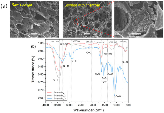 Characterization of sponge media by (a) scanning electron microscope (SEM), and (b) Fourier transform infrared (FTIR) spectroscopy.