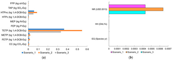 Figure 6 shows the environmental evaluation of the three DHS operational scenarios using the midpoint and endpoint impact categories. At the midpoint level (Figure 6a), the major impacts were related to the categories of ecotoxicity, human toxicity, and climate change.