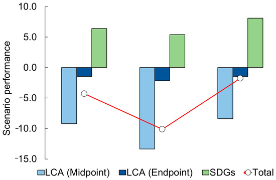 The life cycle impact category results, both at midpoint and endpoint levels, underwent a normalization step to establish a standardized scale for assessment. The normalized outcomes for each scenario were then aggregated, offering a comprehensive overview of each scenario’s performance at both midpoint and endpoint levels. These cumulative midpoint and endpoint results were subsequently integrated with the SDG–Sc normalized results to holistically evaluate the overall performance of the scenarios.