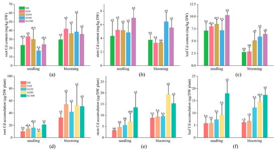 As illustrated in Figure 2a, with an increase in Si concentration, the root Cd content of each treatment showed an increasing trend, which increased by 0.82–12.17 units compared with the control Si0 and did not reach the significant level in all treatments at the seedling and blooming stages of sunflowers (p > 0.05). Compared with the Cd content of sunflower roots at the seedling stage, the Cd content of roots tended to increase with the fertility period, increasing by 6.45–21.60 units across treatments, with nonsignificant (p > 0.05) differences between fertility periods. As shown in Figure 2b, the Cd content of sunflower stems tended to increase with the increasing Si gradient, increasing by 0.50–2.68 units in all treatments and reaching significant levels (p < 0.05) in the Si500 and Si1500 treatments at the blooming stage. Cd content in the stems of all treatments showed a decreasing trend of 0.57–1.90 units compared with the seedling stage, and the difference between the two periods under the Si250 treatment was significant (p < 0.05). As shown in Figure 2c, the sunflower leaf Cd content, compared with that of the control Si0 and Si1500 treatments at the seedling stage and the Si250, Si500, and Si1500 treatments at the blooming stage, significantly increased by 44.23–133.37%, (p < 0.05), and the other Si treatments were nonsignificant. With the prolongation of the fertility period, there was an overall decreasing trend, with significant (p < 0.05) differences in the Si0, Si50, Si250, and Si1500 treatments at the blooming stage compared with the seedling stage. These results demonstrate that, with the growth of the sunflowers, the Cd content of the sunflower roots increased; the Cd content of stems and leaves gradually decreased; and the Cd content in the roots, stems, and leaves of the sunflowers increased with increasing sodium silicate concentrations, especially in the Si500 and Si1500 treatments. Sunflower, an enriched plant, is characterized by the transfer of heavy metals to the aboveground parts for accumulation [47]. However, the Cd level in sunflower roots was higher than that of the aboveground parts in all treatments (Figure 2), and it was not clear whether the heavy metals were transferred from the roots to the aboveground parts after Si addition. The results suggest that the application of Si in Cd-polluted soil significantly increased Cd uptake in all parts of the sunflower during the seedling and blooming periods, and with the prolongation of the fertility period, Cd uptake in sunflowers was mainly concentrated in the roots.