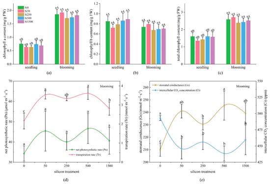 Effect of sodium silicate on chlorophyll content and gas exchange parameters of sunflowers at different reproductive stages. (a) Chlorophyll a content, (b) chlorophyll b content, (c) total chlorophyll content, (d) net photosynthetic rate (Pn) and transpiration rate (Tr), (e) stomatal conductance (Gs) and intercellular CO2 concentration (Ci). Small characters a, b, and c represent significant (p < 0.05) differences among different Si levels under the same growth period; uppercase characters A and B represent significant differences (p < 0.05) between different growth periods at the same Si level.